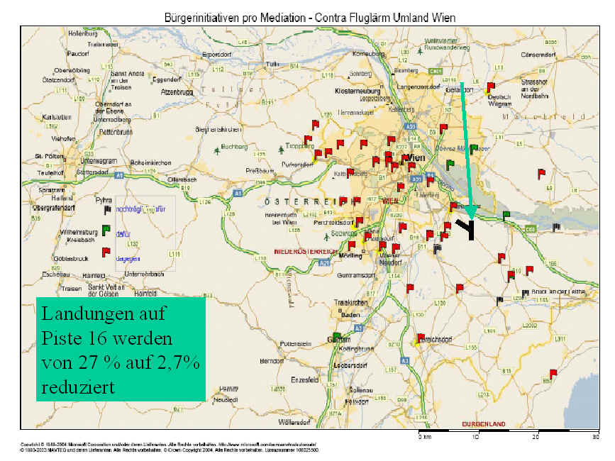 DIE ROTEN FÄHNCHEN ZEIGEN DIE BÜRGERINITIATIVEN, DIE MIT DEM ERGEBNIS DER MEDIATION NICHT WAREN, DIE GRÜNEN WAREN ZUFRIEDEN, DA DIE DURCH DEN BAU DER DRITTEN PISTE DIESER BEREICH ENTLASTET WIRD ( Piste entlang dieser Gemeinden wird praktisch stillgelegt !!!)